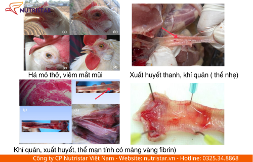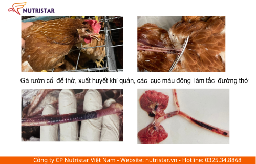 ***Triệu chứng: viêm kết mạc mắt, rướn cổ thở, thở tiếng rít, khò khè, chất nhày lẫn máu ở trên thành chuồng, tường, lồng, mỏ của gà