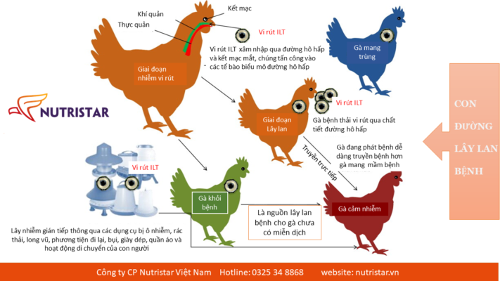 *** Sau khi phục hồi, gia cầm vẫn mang mầm bệnh suốt đời và trở thành nguồn lây nhiễm. Vi rút tiềm ẩn có thể được kích hoạt lại trong điều kiện căng thẳng, gia cầm bị stress. Vi rút ILT dễ lây lan qua dịch tiết, bụi, lây lan cơ học … Một số dịch bệnh có nguồn gốc từ việc vận chuyển gia cầm bị nhiễm bệnh hoặc thiết bị và rác thải bị ô nhiễm.